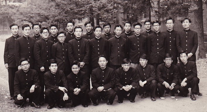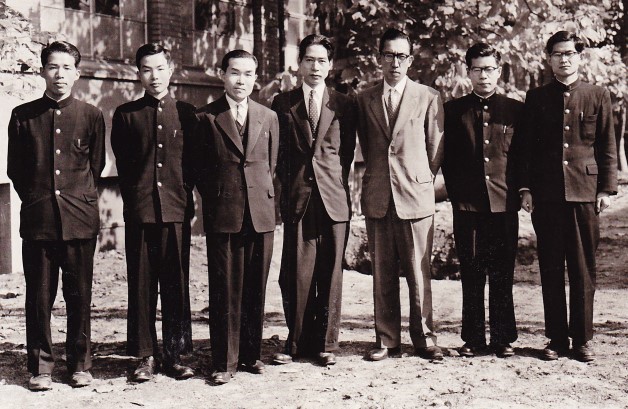 【当時大学生はホボ全員卒業までの4年間学生服を着ていました。角帽は少なくとも入学時は殆どの学生がかぶっていましたが、日が経つとダンダン減り、電気・電子の私の同級生の場合、卒業までかぶっていたのは約80人中タッタ一人でした。】